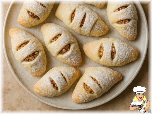 Un ile hamur kabartma tozunu karıştırıp bir kaba eleyin. Üzerine pudra şekeri, şekerli vanilin, margarin, sıvı yağ ve yoğurdu ilave edip iyice yoğurun. Hamurdan ceviz büyüklüğünde parçalar alıp elinizle bastırarak yuvarlak açın. Ortalarına elmalı karışımdan koyun ve hamurların karşı iki kenarını birleştirerek kapatın. Fırın tepsisine sıralayın ve pişirin.