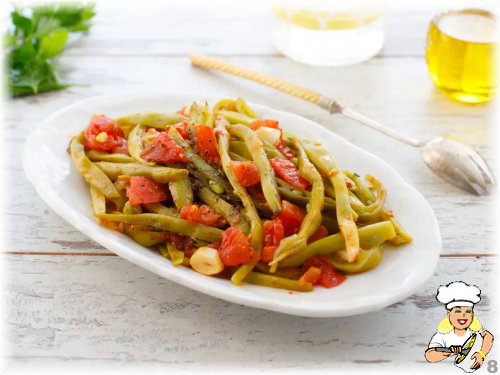 Geniş bir tencereye biraz sıvıyağ dökün. Fasulyeleri alın ve biraz kavurun. Ardından üzerine domatesleri ilave edin. Tencerenin kapağını kapatın ve domatesler suyunu salana kadar pişirin.
