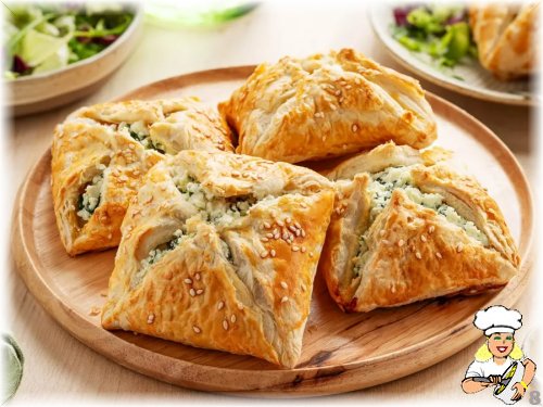 Kıyılmış taze soğan ve maydanozu, baharatlarla ve zeytinyağıyla karıştırın. Oda sıcaklığındaki milföy hamurlarının üzerine soğanlı harçtan koyup katlayın. 200 derecedeki fırında pişirin.